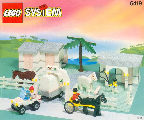 One of our best garage sale finds lately was MOST of a horse stable set. Originally full of details, our Riding Stable (set 6379) has been largely completed using our own extra pieces. We were able to get a very nice setup despite missing some pieces.